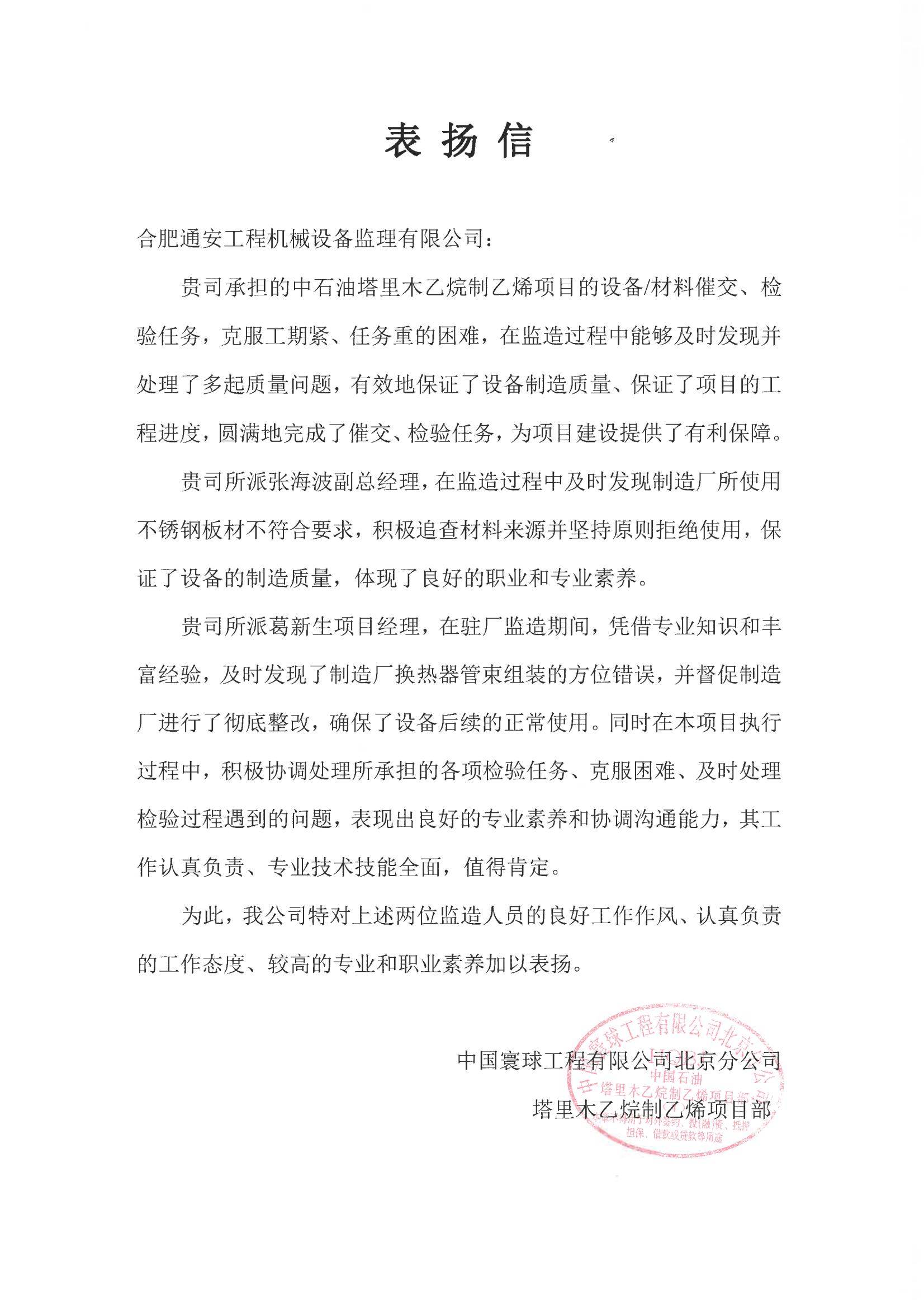 中國寰球塔里木乙烷制乙烯項(xiàng)目表揚(yáng)信