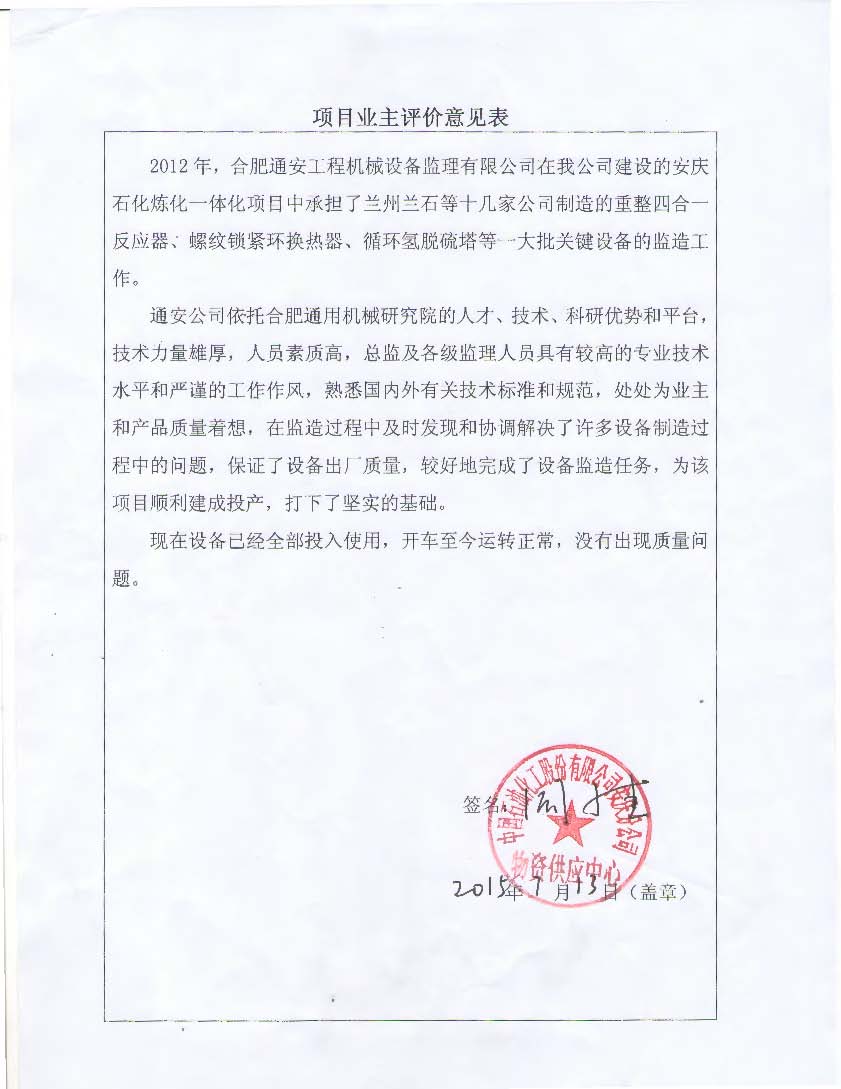 來自安慶石化煉化一體化項(xiàng)目業(yè)主的感謝信