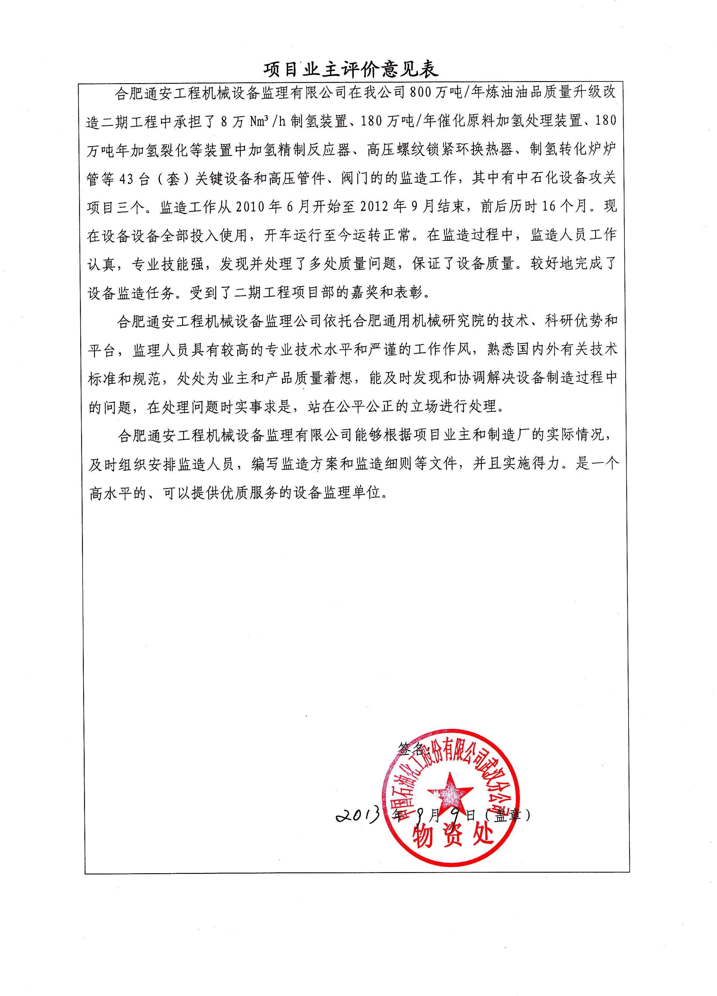 來自武漢石化800萬噸/年煉油油品升級改造二期工程業(yè)主的感謝信