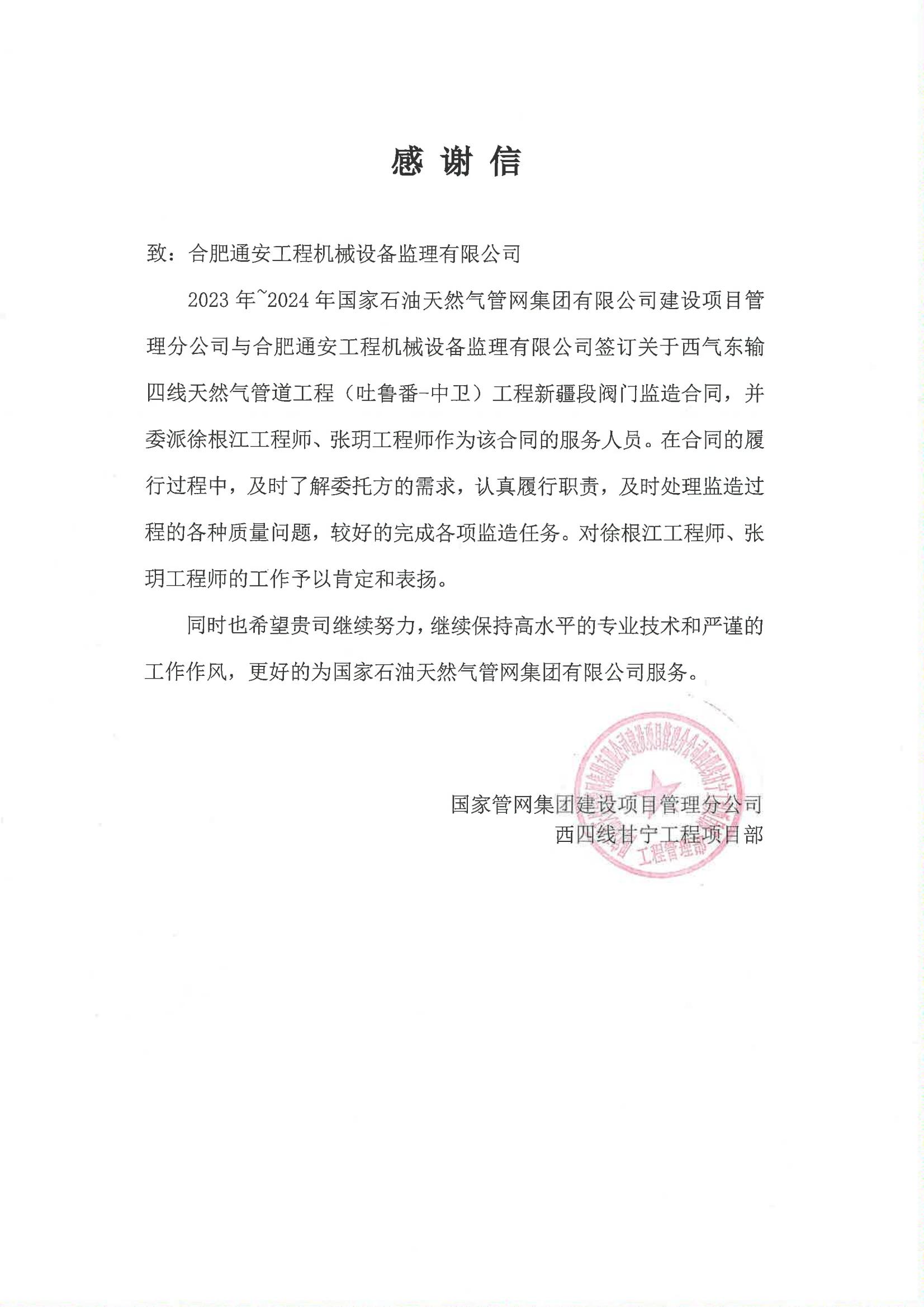國(guó)家管網(wǎng)西四線新疆段感謝信
